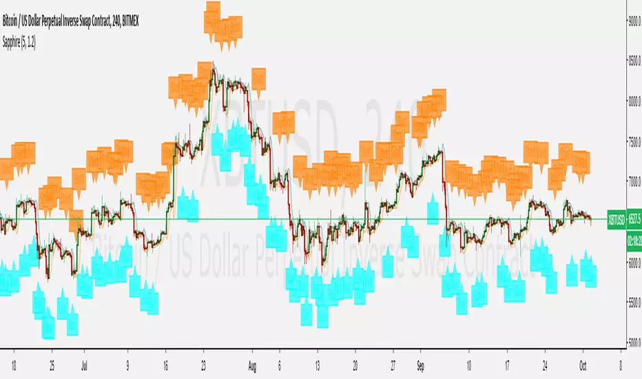 Sapphire looks for standar deviation trade signals and does not filter the results in anyway. You will often be told by the indicator to buy & hold at a loss or to exit positions prematurely and miss out on noteworthy gains (in excess of 15% at times!).
