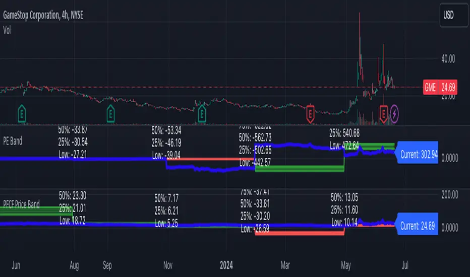 PFCF Price Band shows price calculated using the previous period's high and low P/TTM FCFPS (TTM's price to free cash flow per share over the last 12 months) multiplied by TTM's current FCFPS ( Similar to price theory = P/E x expected earnings per share)