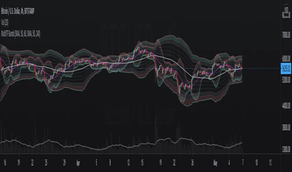 In terms of usage, I like 4h 50 SMA alot . Having two sets of Bollinger bands is nice so you can turn one off or swap between time frames and such. In terms of techniques using both bbands, I haven't really played with it too much yet but simple things like 1h 50sma bbands expanding past the 4h 50sma bbands probably indicate an exaggerated move in that specific time frame, etc etc.