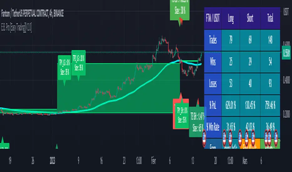 This indicator simulates an efficient trading strategy developed by our team in a simple and effective way, the primary objective when designing it was to make its reading and use as simple as possible for TradingView users. The Backtesting feature has been designed to keep only the most essential information to obtain clear and precise results directly on the graph. The settings interface has also been designed for ergonomic and simplified use. The user is free to customize the parameters as he wishes and according to his trading profile by having the choice, for example, of using options to reduce the risk of loss, to increase the win rate, to optimize profits. Automation is made possible and facilitated thanks to preconfigured alert conditions.