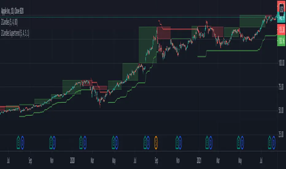 Zigzag candles parameters Length and CandleSize remain as is. Along with this, we also add MALength and AtrMult to calculate ATR based on the new candles and to use it to derive supertrend.