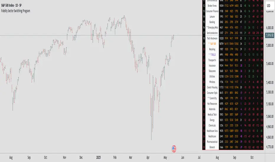 This script analyzes Fidelity sector funds, calculates relative strength ratings, and ranks them by strength. It selects the top 3 funds for holding. Exit triggers: