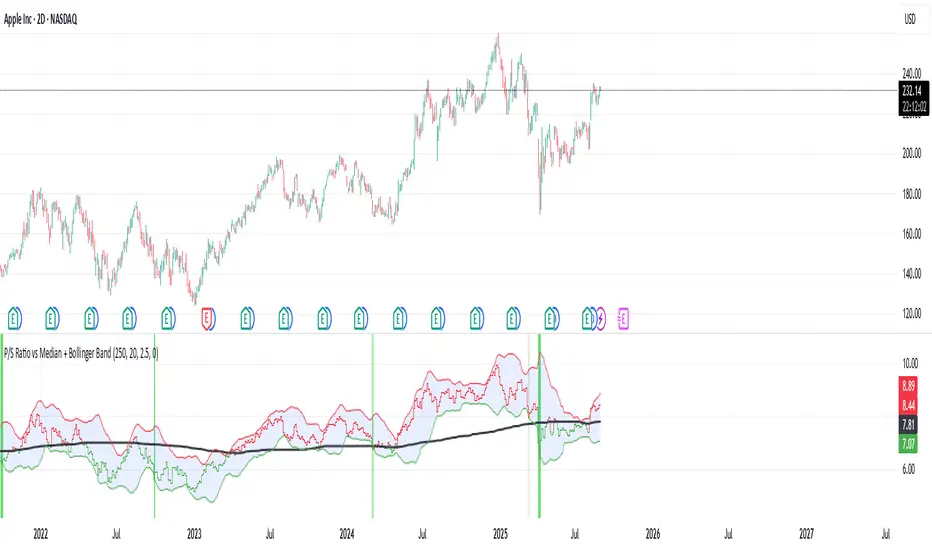 - 📝 This indicator highlights potential buying opportunities by analyzing the Price-to-Sales (P/S) ratio in relation to Bollinger Bands and its historical median.