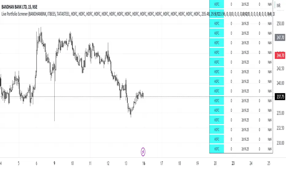 The live portfolio screener indicator is a tool that help users to track the performance of their investments in real-time. The indicator provides a detailed breakdown of the user's portfolio, including the current profit and loss (P&L) for each stock that is invested in. This allows users to quickly and easily see how their portfolio is performing and make informed decisions about their investments on charts. Overall, this tool is an essential tool for anyone looking to stay on top of their investments and make data-driven decisions.