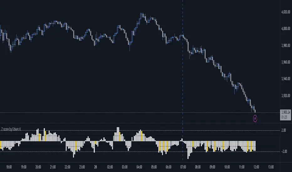 It highlights **price extremes using a Z-score** and colors the histogram when thresholds are crossed.