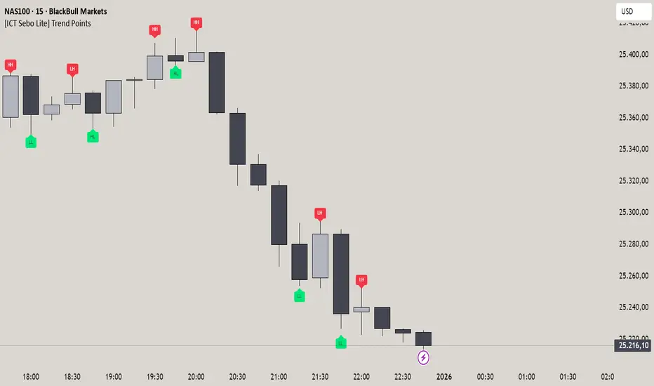 Trend points are plotted directly on the chart using small labels placed at the corresponding swing price. High-based labels are displayed above price, while low-based labels are displayed below price, allowing quick visual identification of structural changes.