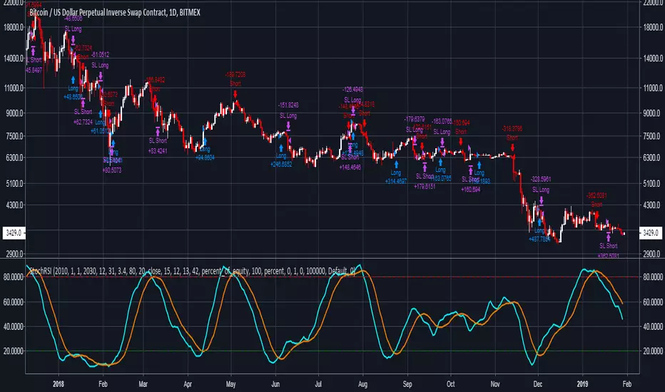 This strategy is based on Stochastic RSI fast and slow line crossing and has the advantage of being adjustable with high degree of freedom.