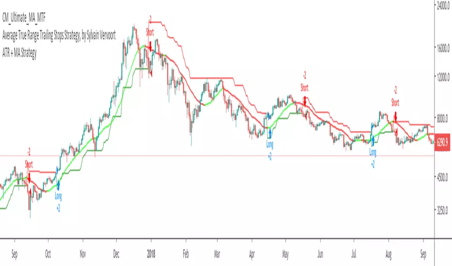 This strategy combines the ATR (average true range) indicator by HPotter and the Ultimate MA indicator by Chris Moody to give buy and sell signals. Links to these indicators are provided below: