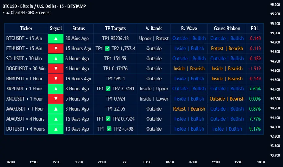 The SFX Screener by Flux Charts is a multi-timeframe market scanner that extracts and visually organizes key conditions detected by the SFX Algo indicator across multiple assets in real-time. It does not perform independent analysis or generate new signals—instead, it pulls data directly from the SFX Algo’s calculations to ensure full alignment across different timeframes and tickers.