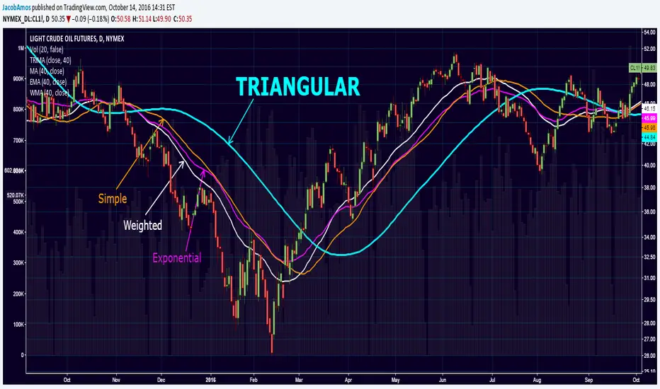 One potential use of this moving average that I've found is that it can allow price to run for a bit after crossing the TRIMA before catching up and creating an opposing signal. It therefore creates the chance for the price to "run its course" so to speak, which can make whipsaw signals less common.