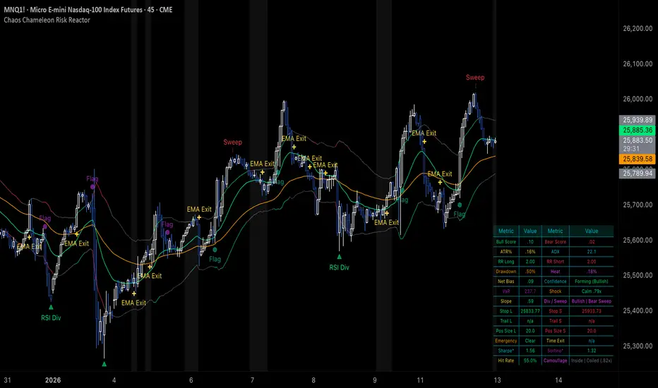Chaos Chameleon Risk Reactor is a Pine Script v6 indicator that fuses pattern-based reversal detection with real-time risk telemetry. It answers two questions on every chart: Is a reversal developing with genuine confluence? And if I take it, what does my risk profile look like right now?
