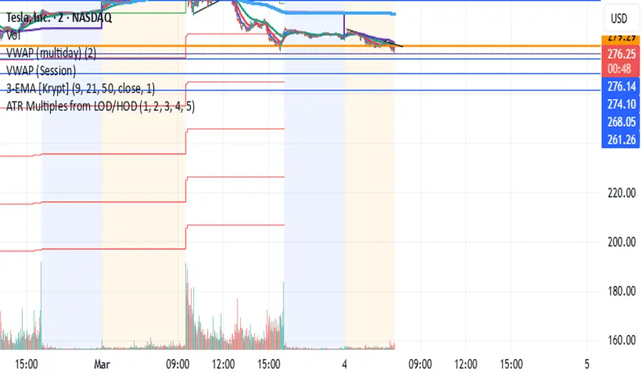 An indicator that plots ATR (Average True Range) multiples from the current Low of Day (LOD) and High of Day (HOD). The indicator should: