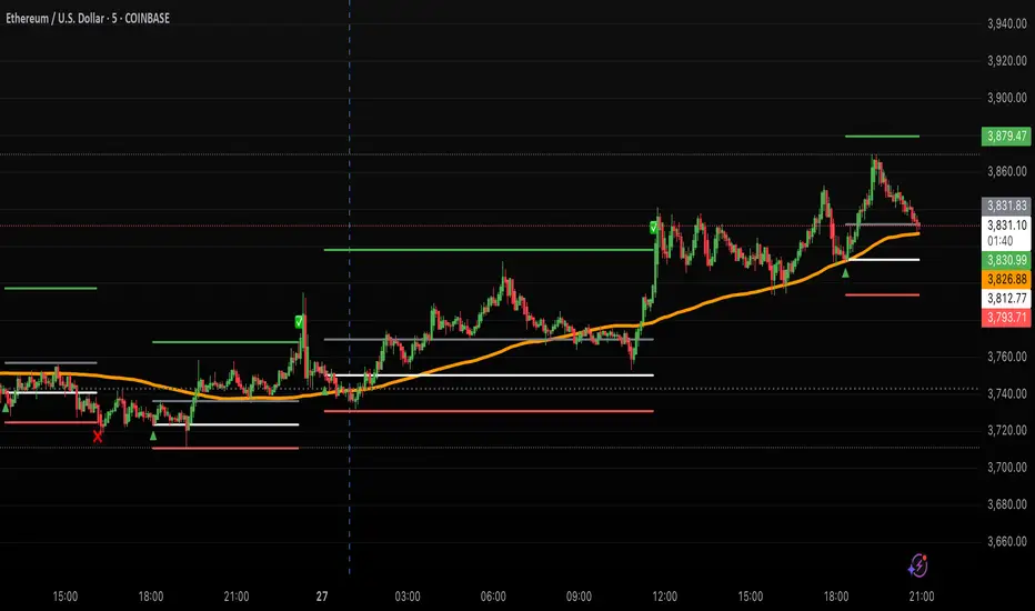 • Exit Markers: Labels show when a trade hits the take-profit (green checkmark) or stop-loss (red cross).