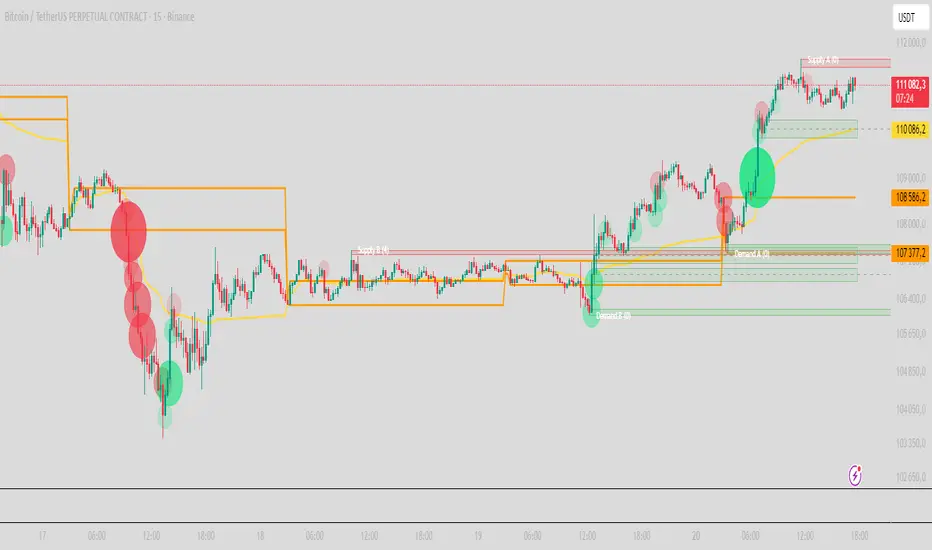 * **Delta bubbles** (green/red circles) show where buying or selling pressure was unusually strong, using a safe **delta proxy** (no external feeds).