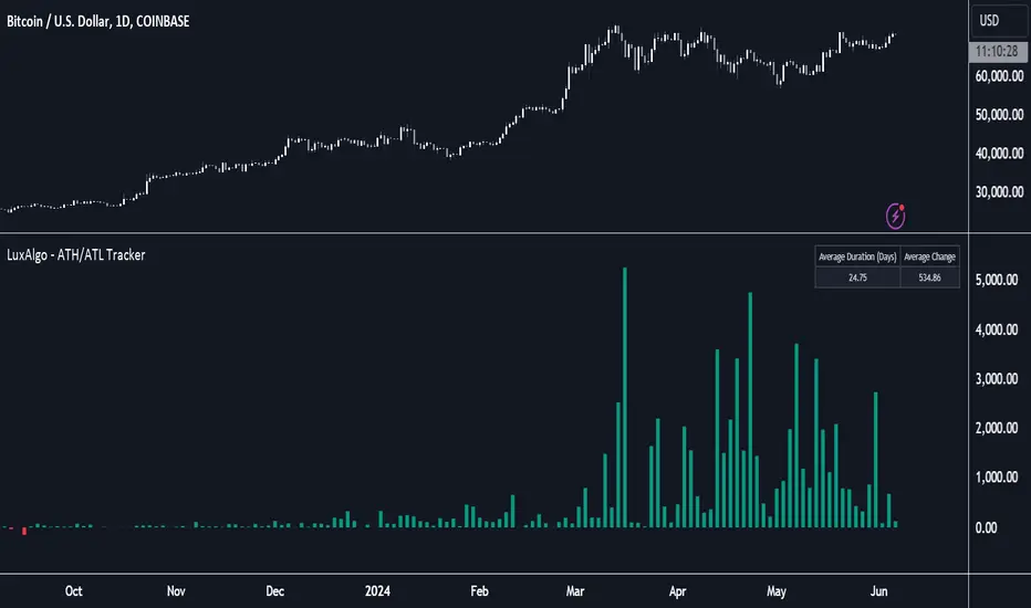 The indicator's main display is a histogram-style readout that displays the change in price from older ATH/ATLs to Newer/Current ATH/ATLs. This change is determined by the distance that the current values have overtaken the previous values, resulting in the displayed data.