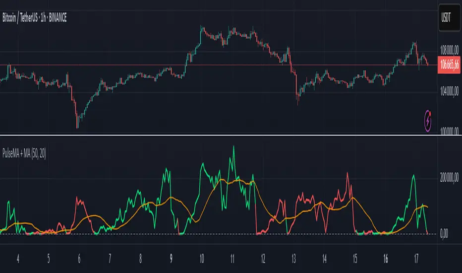 Smoothed Average (PulseMA MA): Adds a smoothed SMA, facilitating the identification of long-term changes in market momentum.