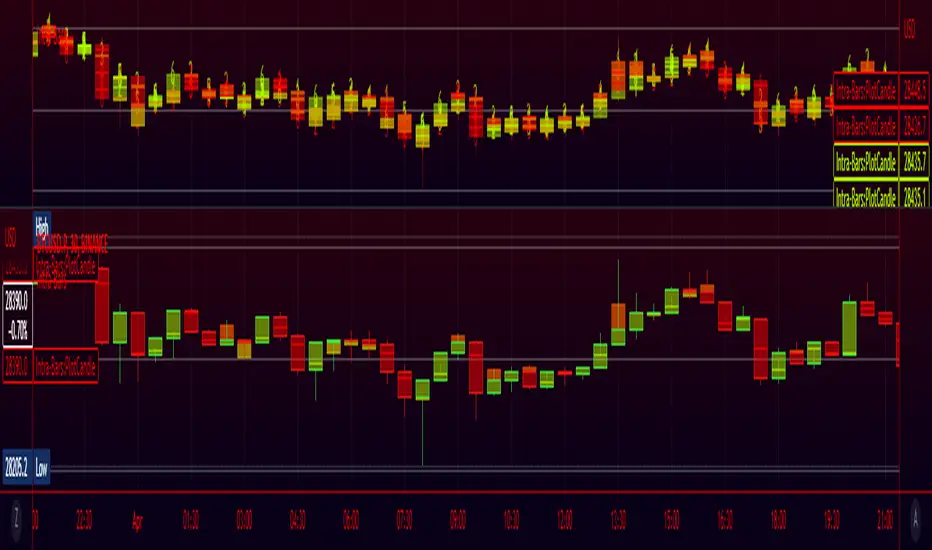 Indicator for more informative candle plotting. Select from 2-6 lower timeframe candles and view the price action of the lower bars within the normal chart's candles. Plotting short time frame candles with a semi-transparent body lets you see reversals that occurred during the larger candle's formation. Use the information provided to inform your own trading decisions.