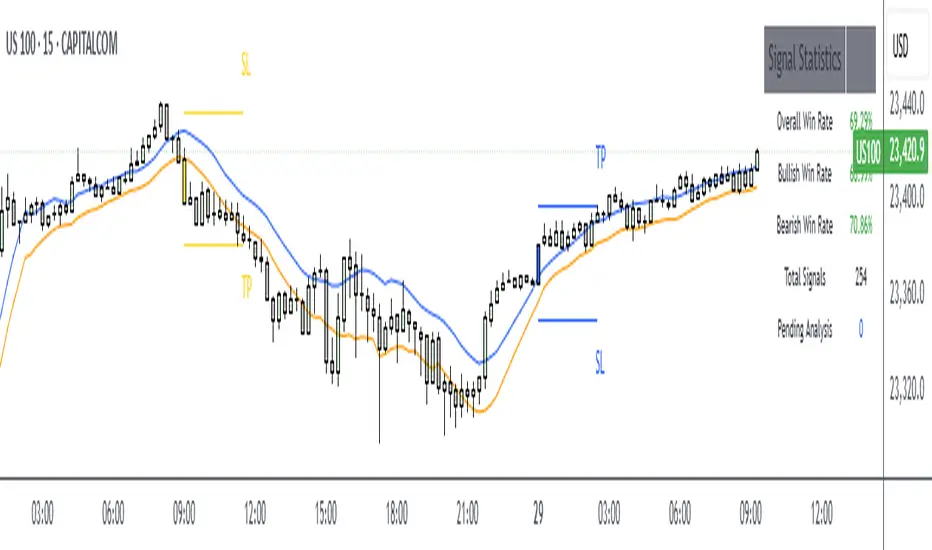 This tool identifies breakout candles from a calculated channel range and visually simulates entries, stop losses, and take profits, providing live and historical performance metrics.