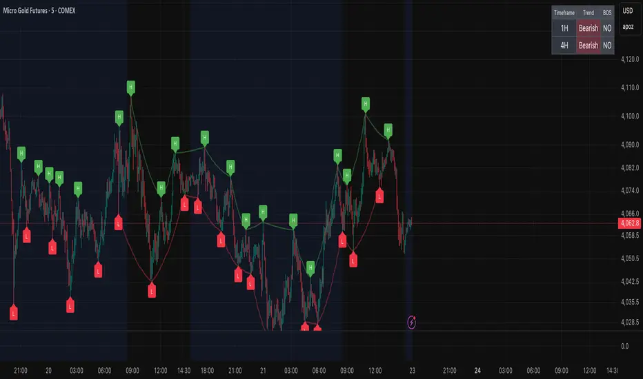 This indicator identifies swing highs and swing lows on the chart with visual labels and connecting lines, plus provides trend analysis across multiple timeframes.