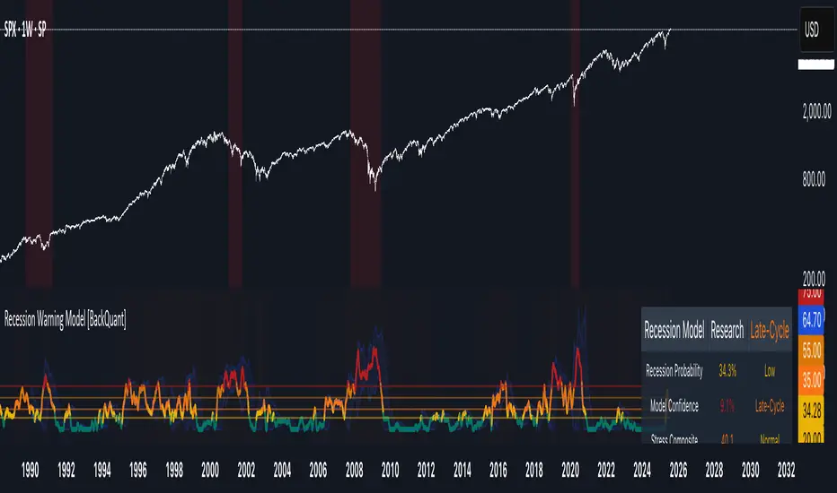 The Recession Warning Model (RWM) is a Pine Script® indicator designed to estimate the probability of an economic recession by integrating multiple macroeconomic, market sentiment, and labor market indicators. It combines over a dozen data series into a transparent, adaptive, and actionable tool for traders, portfolio managers, and researchers. The model provides customizable complexity levels, display modes, and data processing options to accommodate various analytical requirements while ensuring robustness through dynamic weighting and regime-aware adjustments.