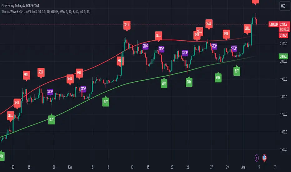To explain briefly; It is a layered oracle algorithm that gives signals by filtering the formations (Normal and Harmonic formations) created by multiple account movements containing many calculations and algorithms, based on the instantaneous momentum of the price and the overbought or oversold levels in a certain time period. Of course, formations refer to situations in which price movements occur in a certain order in financial markets. These patterns are specific patterns seen on the price chart and can often provide clues about future movements of prices. For example; Reverse Shoulder, Head and Shoulder, Symmetrical Triangle etc. Dozens of formation formation conditions and targets were filtered and made suitable for signaling. It also creates bands using YDK3 with the channel algorithm it contains. This band is usually calculated using the standard deviation method to measure price movements and indicate a specific deviation. The upper and lower bands obtained as a result of standard deviation calculations are drawn on the price chart. After a certain band is created, automatic expansion is carried out in order to predict possible movements of future prices. Additionally, Winningwave includes Ema calculations and has identified stop points after the main entry signal to help you in case you miss the main exit signal or choose a different strategy.
