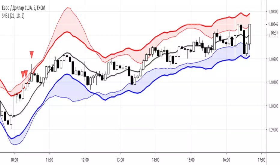Indicator «SN30» consists of central channel line (green line based on linier regression) and price channels (2 blue and 2 red lines with colored zones between them). Colored zones are of two types: red (overbought zone) and blue (oversold zone). They are used to define deviations of the current prices from their fair values. When the price enters the red zone it should reverse soon (the prices will go down). The same is true for the blue zone (the prices will go up).