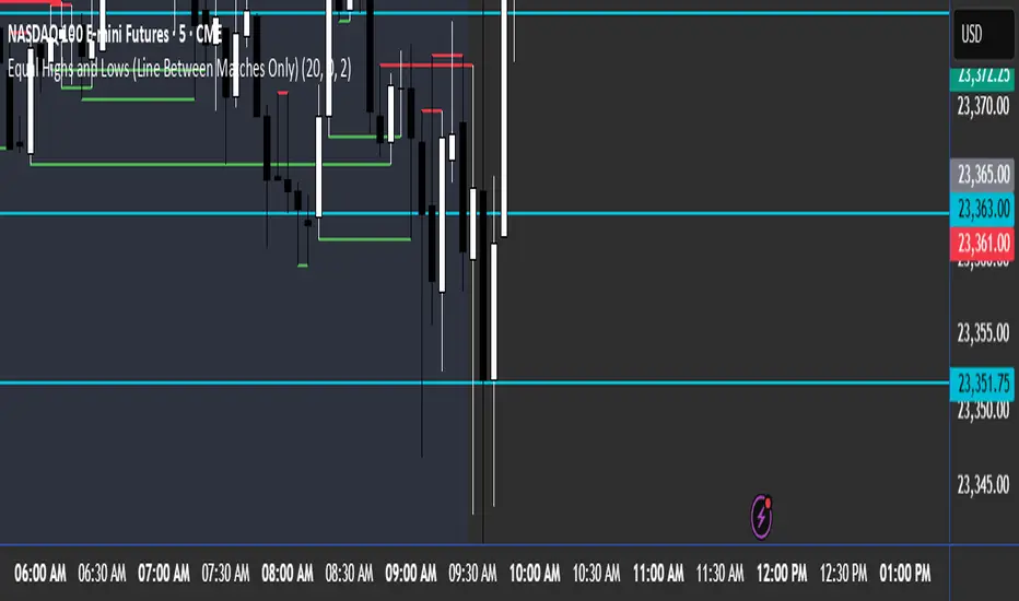 marks out equal highs and lows with a solid red line and solid green line. Only marks out till the next candle
