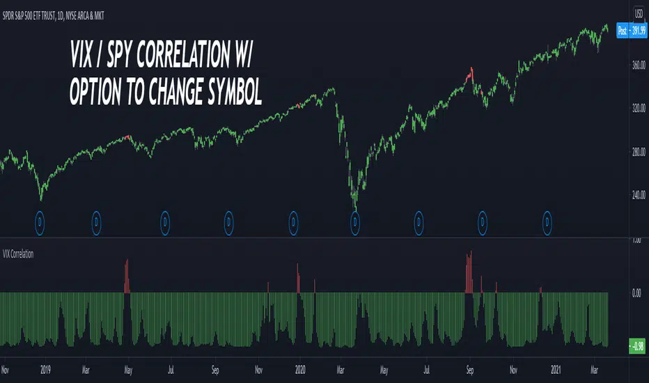 Indicator tracks the 10 day correlation with VIX. I prefer to use this with SPY. Can be a great way to flag tops/melt-ups.