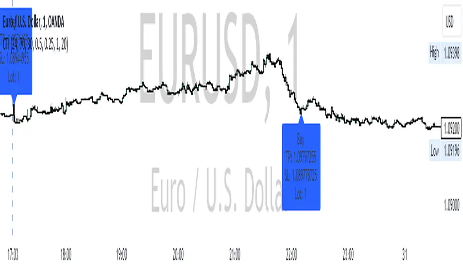 The indicator generates a buy signal when the CCI crosses above -100 (indicating a potential bullish reversal) and the RSI is below the specified oversold level. On the other hand, a sell signal is produced when the CCI crosses below 100 (indicating a potential bearish reversal) and the RSI is above the specified overbought level.