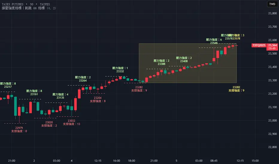 🟡撐壓強度指標|凱龍 06 指標🟡指標說明:抓取價格支撐(預設為紅色)壓力(預設為綠色),並透過多種元素分析支撐壓力強度(數字越大代表強度越高)。指標亦將自動抓取最新的支撐壓力區塊(預設為黃色)。