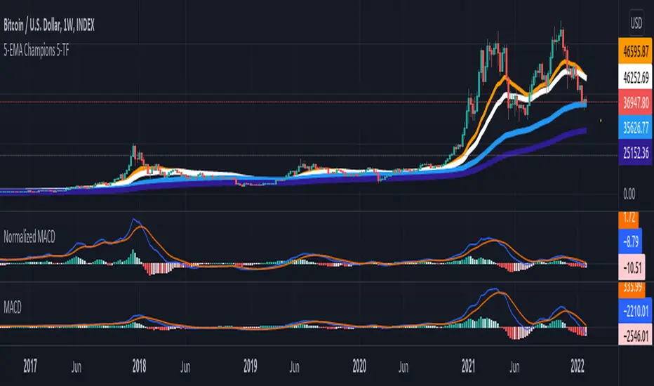 This MACD is exactly like standard MACD, but extremely stable and normalized by EMAs(200,150,100,50,30).