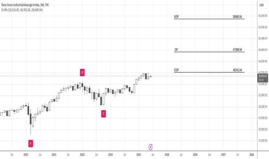 The DiNapoli Objective Points (OPs) is a drawing tool that computes potential exit targets to a market. It does so by drawing Fibonacci ABC Extensions which form Areas that might condition future market moves. This is a Leading Indicator created by Joe DiNapoli.
