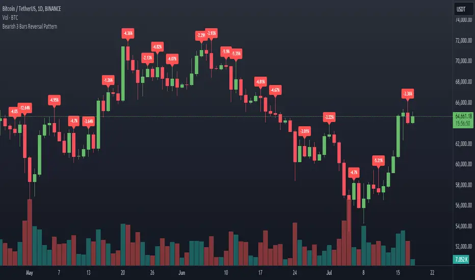 This TradingView Pine Script indicator identifies and highlights a bearish 3-bar reversal pattern on your chart. The script also calculates the percentage difference between the current low and the previous high, displaying this value on the chart when the pattern is detected.