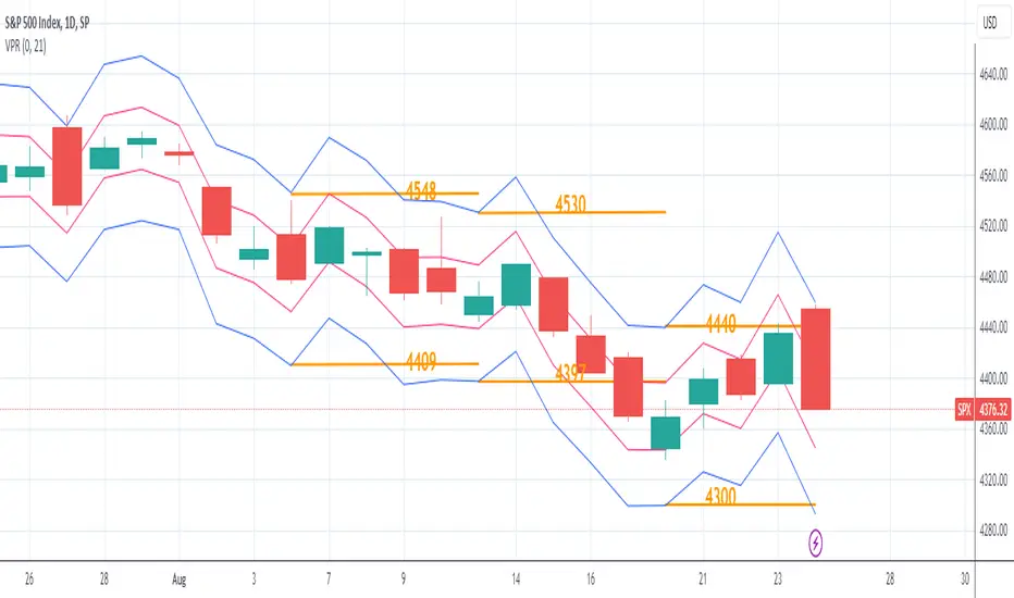 The Volatility Price Range is an overlay which estimates a price range for the next seven days and next day, based on historical volatility (already available in TradingView). The upper and lower bands are calculated as follows:
