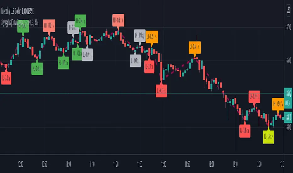 drawzigzag(length, , source, linecolor, linewidth, linestyle, oscillatorSource, directionBias, showHighLow, showRatios, showDivergence) drawzigzag: Calculates and draws zigzag pivots