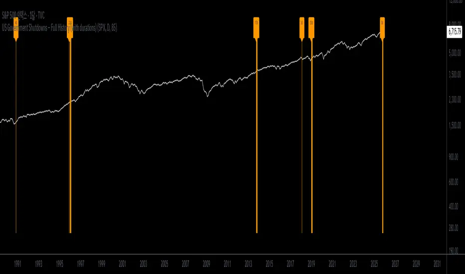 This indicator visualizes all official US government shutdown periods since 1976 directly on any selected chart (default: S&P 500).