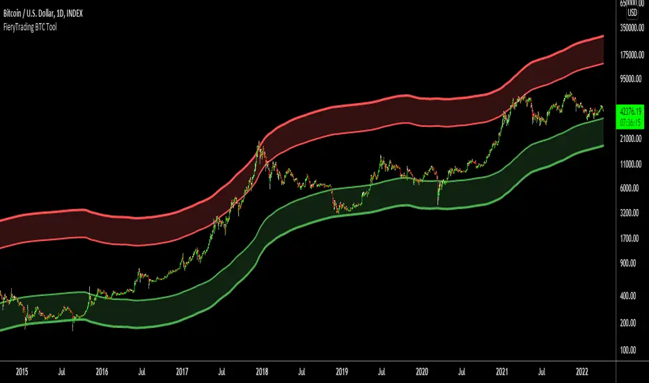 This scripts consists of two price bands, green and red. The green band has historically been a great area for the accumulation of BTC, whilst the red area has historically been a great area for exiting BTC. You could say that if the price is in (or below) the green bands BTC is undervalued, with the opposite being true for the red bands.