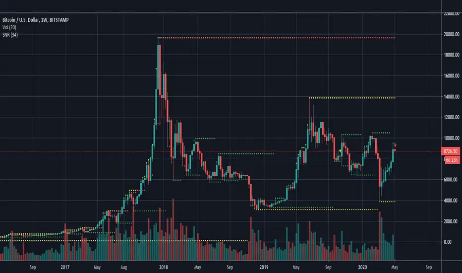Simple indicator showing the support and resistance on Daily, Weekly and Monthly time frames no matter what time frame you're currently on by highlighting the highest and lowest points on each over the last 34 bars.