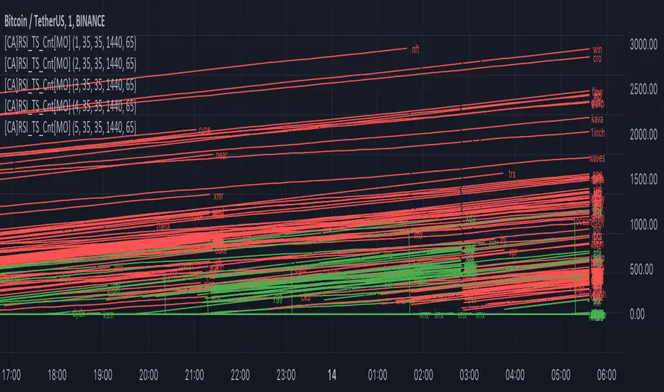 Fixed code to make the "max plots / max labels / max alerts" work as it was accidentally incomplete. Also, added a name label as well as a separate "prohibited" unicode character label on top of the old "max" coin label (red circle with a line through it) indicating the old "max" coin has reversed sides (ie. previously the coin had the top Bullish RSI-Side Count of the group but is now Bearish thus is no longer the 'max" of the set...and vise-versa). Btw, I decided NOT to do the same for all of the regular plots (if NOT viewing only the "max" of the set) due to the severe cluttering/confusing aspect it provides when many coins are being viewed rather than JUST the "max". The instructions to view ONLY the max plot & max labels as well as the NEW MAX ALERT can be found on lines 81, lines 122, and lines 157. Hope it becomes of some use to you...and as always ENJOY YOUR FIGGIN DAY!!!開源腳本