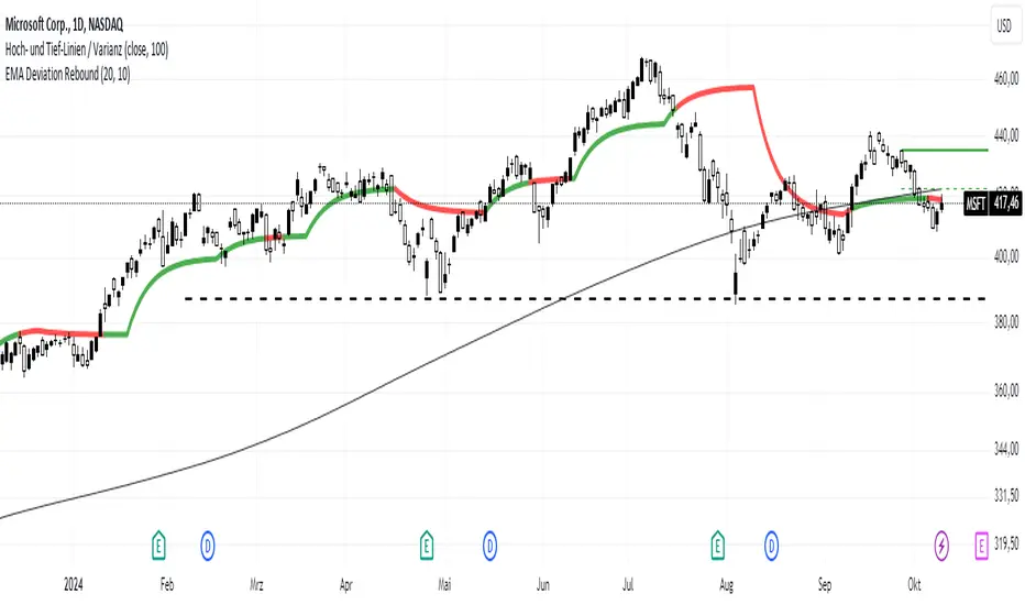 The "EMA Deviation Rebound" indicator I've created utilizes calculations involving the standard deviation of closing prices and exponential moving averages (EMA) to generate a line. The color of this line changes based on whether the EMA value is above or below the current closing price. This can be interpreted as an indicator for potential buy or sell signals: