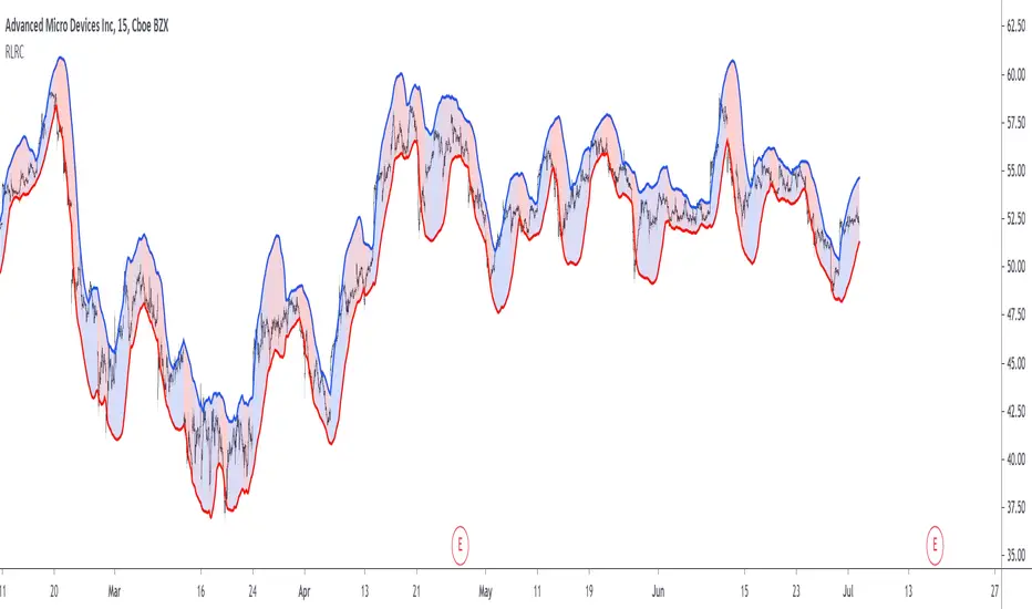 In blue/red the indicator, with the linear regression channel in orange with the same length/mult settings, the last circle of the upper band is equal to the last value of the upper regression channel, same thing with the lower band, you can see this more clearly using the replay mode.
