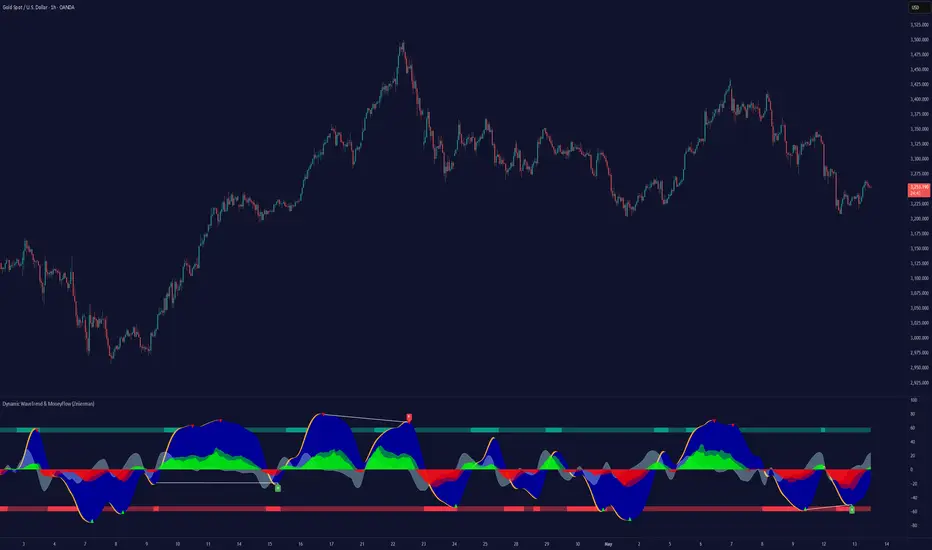 █ OverviewThe Dynamic WaveTrend & MoneyFlow (Zeiierman) indicator is a versatile market analysis tool designed to capture momentum shifts, trend strength, and capital flow dynamics in real-time. It adapts to changing market conditions, providing traders with a comprehensive view of market structure, trend momentum, and volume pressure.