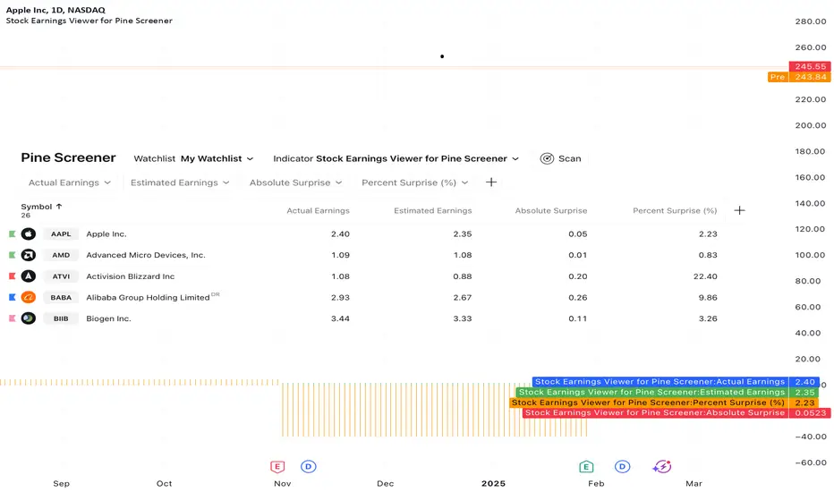 The script, titled "Stock Earnings Viewer with Surprise", fetches actual and estimated earnings, calculates absolute and percent surprise values, and presents them for analysis. It is intended to use in Pine Screener, as on chart it is redundant.