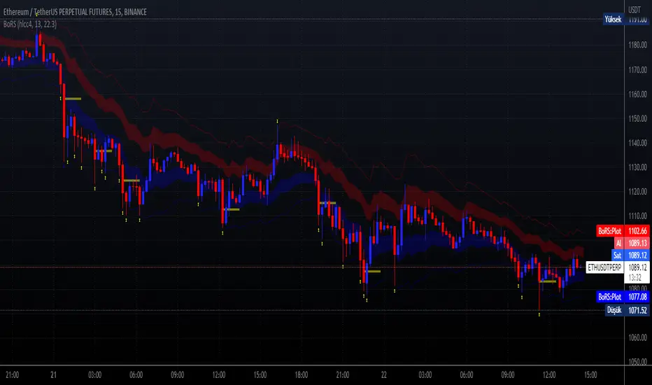 Band of Filtered RS by Mustafa ÖZVERThis code shows a range (max-min values) price may get if we get strong movements. These values is based on RSI (Relative Strange Index). And also these are calculated using RSI , if we get trades to make rsi is equal to 25 (or rsi down limit) or 75 ( rsi up limit) or any value you set, how much will price value get? This code calculate these and shows these to you on graph.