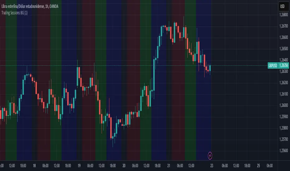 This indicator provides a visual representation of the major trading sessions — Asia, London, and USA — by applying distinct background colors to the chart. It allows traders to easily identify active market hours and session overlaps.