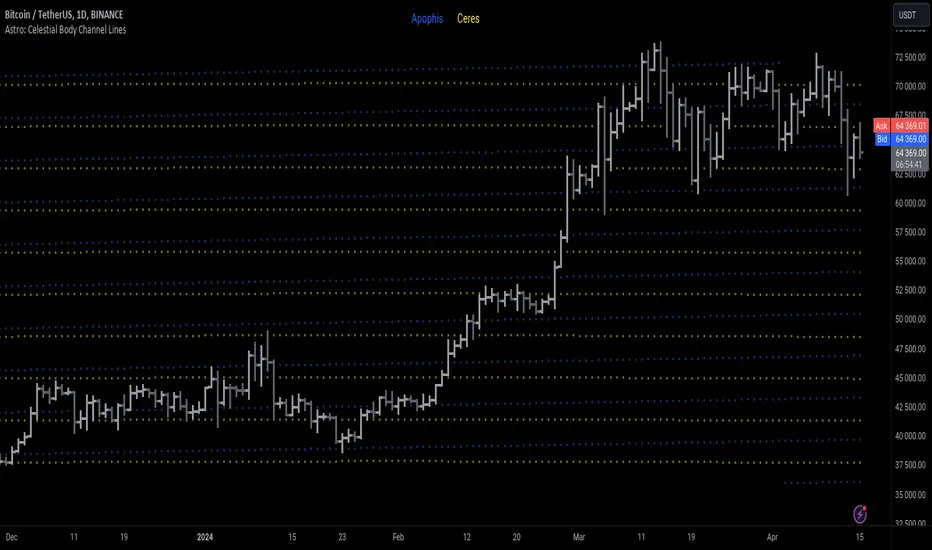 This is fork of the previous Astro: Planetary Channel Lines indicator that now includes over a dozen different celestial bodies, made possible after the most recent update of the AstroLib library.
