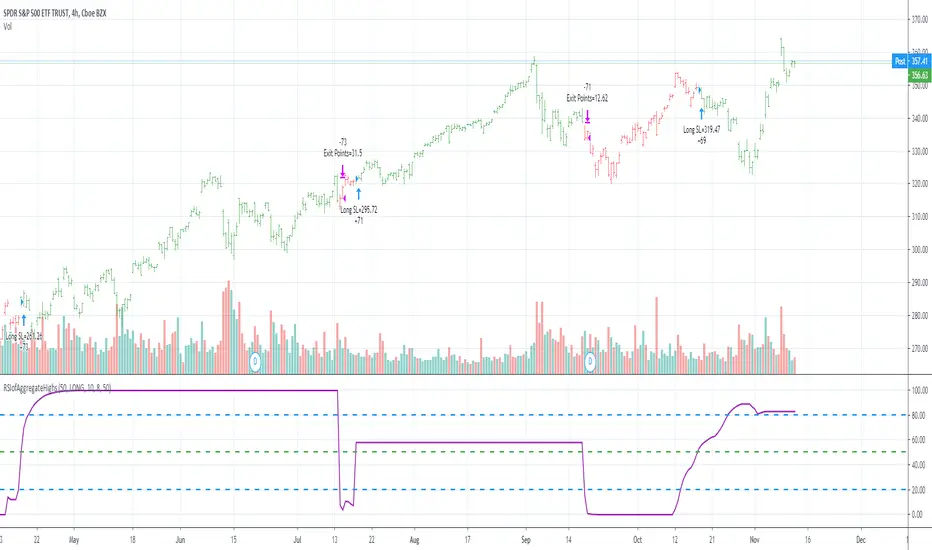 This strategy is based on aggregate of highs of specified length. Then this value is input to RSI 14 period.
