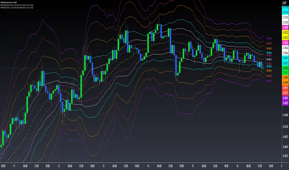 Hi Everyone!Josue fixed an error on the "fill" of the percentage spread between the white upper and white lower B-Bands. Of course, the percentage of this spread can be changed in settings. You can also choose if you want to "fill" the historical spread between the white B-Bands and choose to "show" (display) the percentage spread numerically in the current candle.