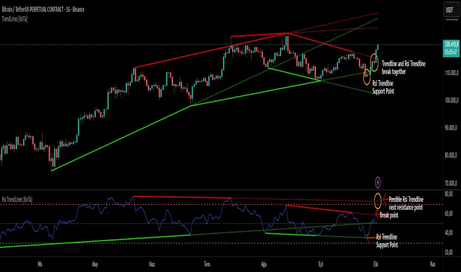 The "RSI TrendLines with Breakouts [KoTa]" indicator is a custom Pine Script tool designed for TradingView. It builds on the standard Relative Strength Index (RSI) by adding dynamic trendlines based on RSI pivots (highs and lows) across multiple user-defined periods. These trendlines act as support and resistance levels on the RSI chart, and the indicator detects breakouts when the RSI crosses these lines, generating potential buy (long) or sell (short) signals. It also includes overbought/oversold thresholds and optional breakout labels. Below, I'll provide a detailed explanation in English, covering how to use it, its purpose, advantages and disadvantages, example strategies, and ways to enhance strategies with other indicators.