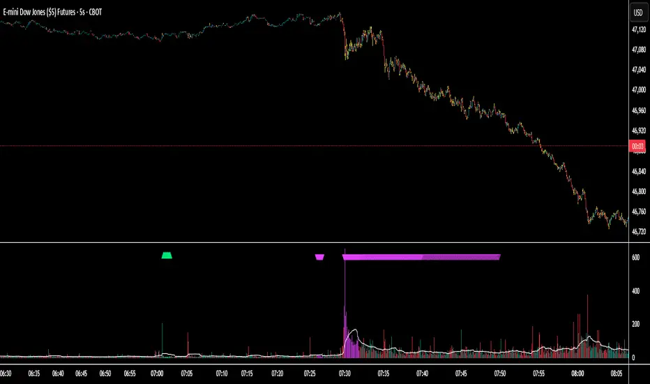 This version adds MTF awareness, showing spikes from 1-minute, 5-minute, and 10-minute frames on a single chart. It’s ideal for traders monitoring microstructure shifts across multiple time compressions while staying on a fast chart (like 1-second or 1-minute).